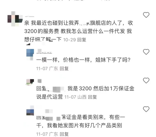 除此之外,锌刻度发现,在各大社交平台,有不少人声称提供旗舰店代办服务。有网友表示,“我最近就朋友让我弄旗舰店的,收3200元的服务费,教我怎么运营。”据该网友出示的费用明细,3200元可以将某电商平台旗舰店资质代办好,其中包括企业执照、地址挂靠、旗舰商标授权及授权资料等等。