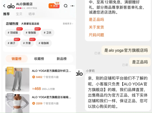而这家店铺的客服在面临“是alo yoga官方旗舰店”的质疑时,回复也是同样的路数,“小客服只负责ALO YOGA官方旗舰店哦,我们品牌直营,出售商品均为官方正品”,而其经营企业为上海翰硕盛电子商务有限公司。