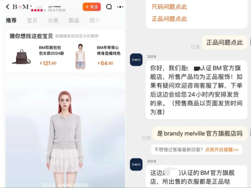 而当互联网姐妹热心回复她,“宝,你是不是买错了?BM在线上只能在官方APP下单哦。”乔乔一看,翻出之前从线上旗舰店买来的衣服一看,顿时欲哭无泪,“商标竟然写的是BRENBY MAIVLIE”,由于这家店内的服饰风格与BM极其相似,价格也差不多,加之“旗舰店”三个字,乔乔从未怀疑过。
