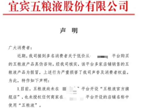 而今年,也有五粮液官网发布声明称,近期,公司接到多名消费者关于低价从一电商平台购买的五粮液产品真伪咨询。经公司核实,该平台多家店铺销售的五粮液产品为假冒,上述行为严重损害了五粮液声誉及消费者权益。五粮液表示,目前,公司尚未在该电商平台开设“五粮液官方旗舰店”,也未授权任何商家在该电商平台开设的店铺名称中使用“五粮液”。