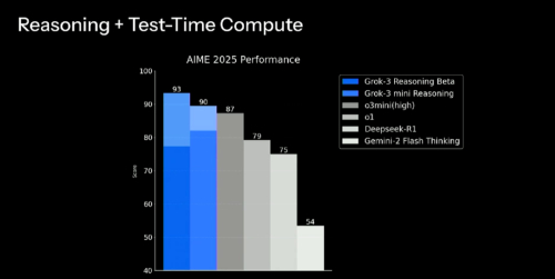 在推理能力方面,Grok 3的表现同样超出预期。在 AIME 2025 数学竞赛的测试中,两个推理模型Grok-3 Reasoning Beta 和 Grok-3 mini Reasoning两个版本分别以93分、90分的成绩超过同比大模型。