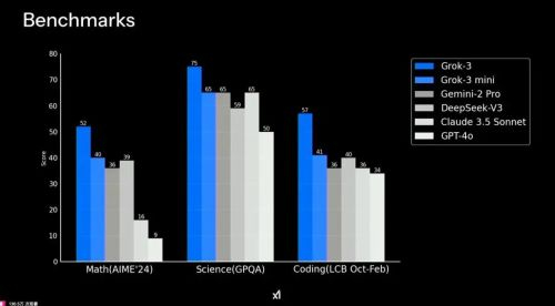 在与DeepSeek-V3的对比中,Grok 3也有优异的表现,AIME'24数学能力测试以 52 分超 过DeepSeek-V3 的 39 分。GPQA 科学知识评估以75 分超过DeepSeek-V3 的65 分。LCB Oct-Feb 编程能力测试以57 分超过DeepSeek-V3 的 36 分。