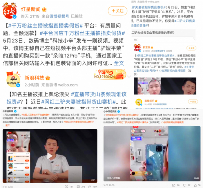 事件一出,得到了很多科技数码大V的转发,仅一天酝酿,“二驴卖山寨手机”词条就登上了热搜榜,5月24号到29号期间,闻着味的王海也开始了多轮的暴击,甚至澎湃新闻、中国经营报和新京报等一批官媒都先后转发,至此,二驴夫妻售假事件正式引爆全网。