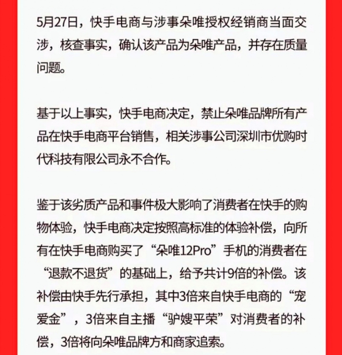 快手和朵唯也迫于压力,纷纷出通告安抚买到山寨手机的消费者,快手甚至给出了“假一赔九”的高标准赔偿方案,即快手平台方、涉事主播以及涉事品牌方,均给予消费者3倍购机款赔偿,且退款不退货,而依据二驴夫妻直播间的销售数据,大约带货了3万台朵唯手机,也就是说,二驴夫妻和快手及朵唯各需承担约1.3亿元的赔偿款,此一来,指望带山寨牟利的二驴夫妻是“赔了夫人又折兵”,但这一切,皆是咎由自取。