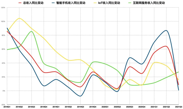 能影响业绩大盘的,目前只有手机业务。一直以来,手机业务都是小米的“基本盘”,总收入与手机业务收入的变动趋势基本保持同频共振。