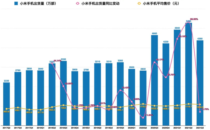 只有小米手机卖得多,小米业绩才能好。第三季度,小米手机出货量4390万部,同比减少270万部,比上一季度更是少卖了900万部。
