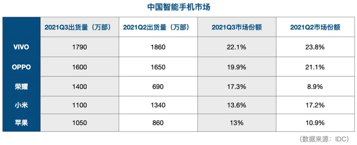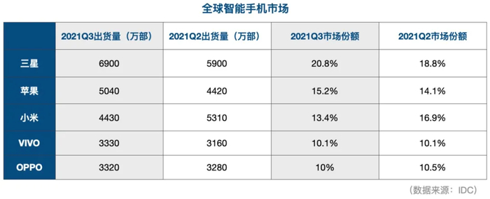 想要站稳全球第二的位置并不容易。IDC数据显示,2021年第三季度,小米以13.4%的份额退居全球第三位,苹果以15.2%的份额重回全球第二。