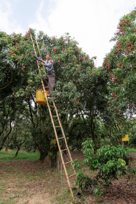 今年虽然是丰收季,但何叔仍有担忧,5月以来,广东气温回升太快,却很少雨水,荔枝成熟之后的采摘期被干旱和高温缩短,何叔无奈地面对成熟的荔枝不断爆果的境况。他来回攀爬着高梯,每日不间断地采摘。荔枝不能等,他渴盼下树的荔枝,能以最快的速度,送到食客的餐桌上。