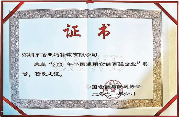 怡亚通物流“2020全国通用仓储百强企业”证书。