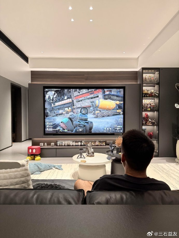#百吋电视京东直播比价贵1分赔1万#买了百寸电视打游戏也太爽了吧!3.5米观影距离刚好,电视柜设计超贴心——左侧嵌电视、藏零食,右侧玻璃柜摆盲盒还带灯带,下翻柜门能装又好打扫。线路藏得超干净,大屏玩着沉浸又护眼,氛围直接拉满~