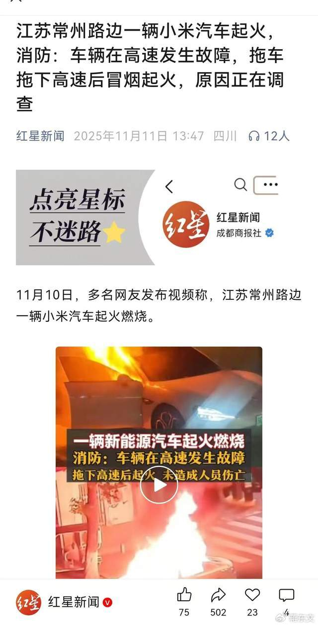 据红星新闻报道,11月10日,江苏常州路边一辆小米汽车起火燃烧了,所幸这次没人受伤。车辆在高速发生故障,拖车拖下高速后冒烟起火,消防赶到后将火扑灭,无人员伤亡,起火原因正在调查中。