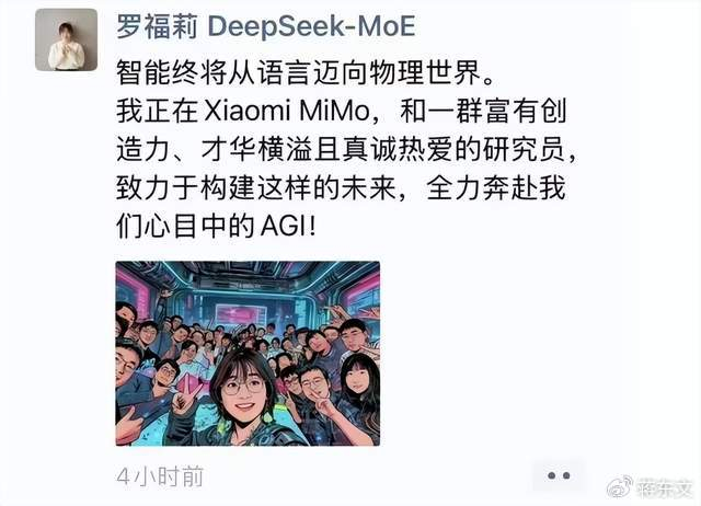 前DeepSeek研究员罗福莉日前在朋友圈发文称:智能终将从语言迈向物理世界。我正在Xiaomi MiMo,和一群富有创造力、才华横溢且真诚热爱的研究员,致力于构建这样的未来,全力奔赴我们心目中的AGI。