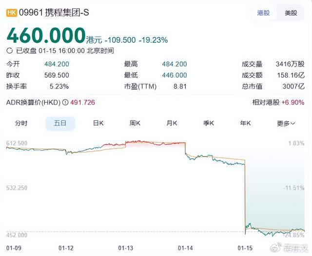 1月13日,携程港股刚刚触达613港元/股的历史峰值,市值超4000亿港元(约3600亿元)。14日,携程港股就直线下跌,收盘跌超6%;今天携程港股依然重挫,一度跌超20%,截至收盘,跌19.23%,报收460港元/股,最新市值3007亿港元,两日市值蒸发近1000亿港元。