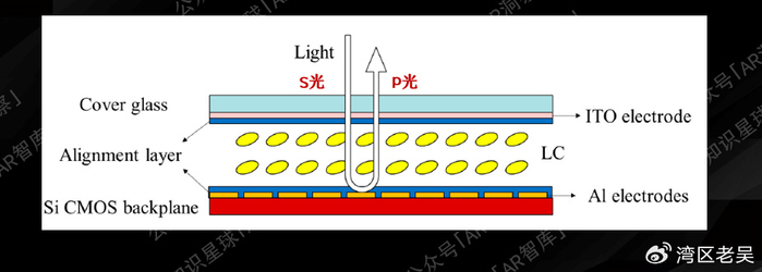 LCOS的像素,是通过CMOS工艺制成像素电极,去单独控制每一个液晶像素分子层。通过施加不同电压,使液晶分子有不同取向。液晶取向不同,会让光的透过率从0到100%调节。0就是全暗,100%就是全亮,中间就是灰阶。由于这些像素电极是一体式半导体工艺完成的,并不需要像MicroLED那样先生长再转移,LCOS全彩量产难度低很多。