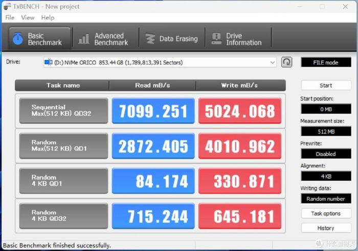TxBench测试中奥睿科 OSC 冰甲固态硬盘1T容量的读取速度7099MB/s,写入速度5024MB/s。重复数次测试,数据波动非常细微,表现十分稳定。这个速度直接是我之前PCIe 3.0平台上SSD的2倍以上,这性能真的太强了。