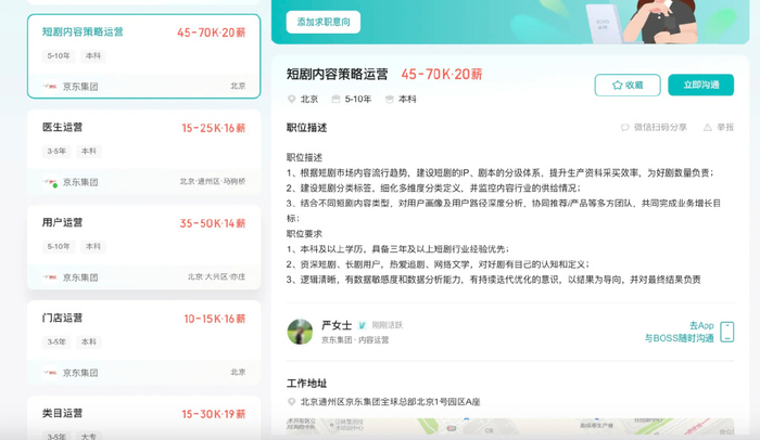 7月10日,有网友发现京东在招聘平台开始发布短剧内容运营岗位。