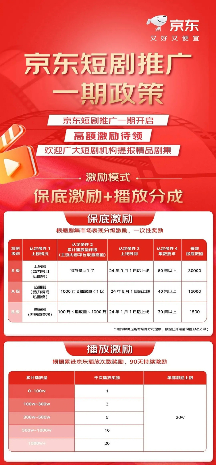 3月,京东宣布启动2025年短剧推广一期政策,推出“保底激励+播放分成”双轨制,吸引短剧机构入驻。