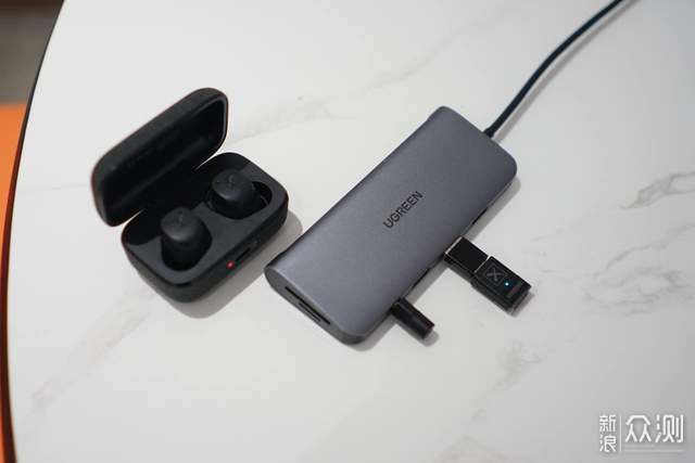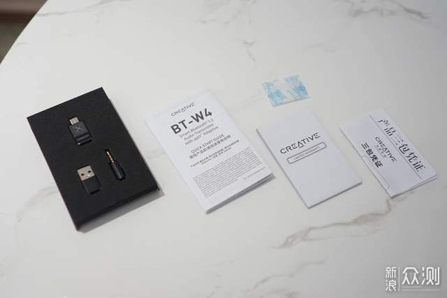 打开包装可以看到蓝牙音频发射器、USB-C转A转接头和3.5mm AUX插头的模拟麦克风,除此之外还有说明书,日常使用这些配件也足够了。
