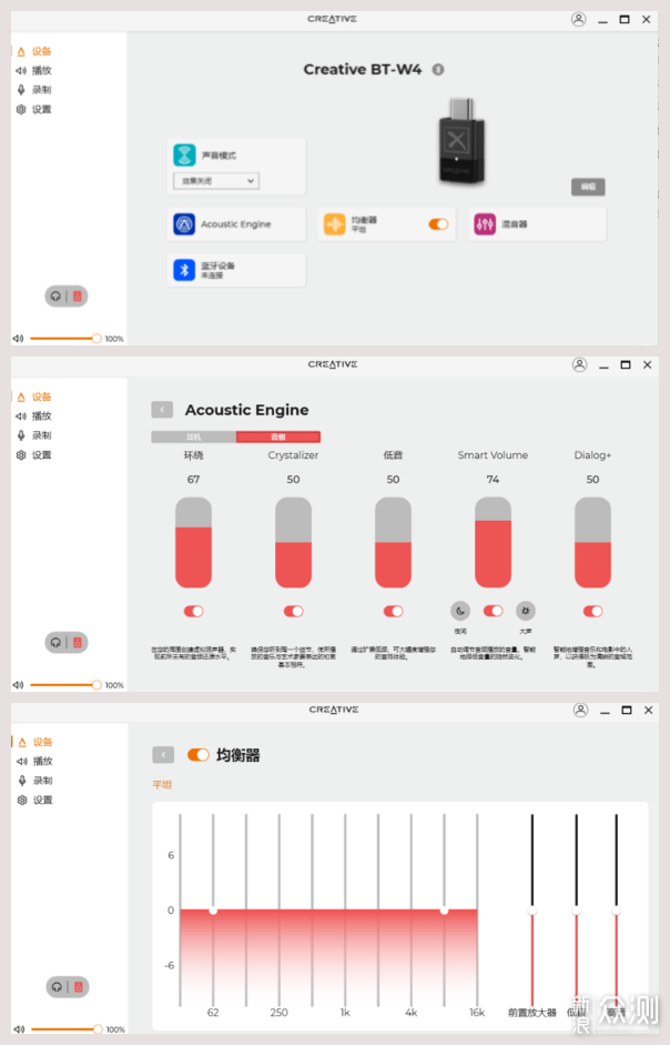 创新BT-W4的应用界面非常简洁,界面主要包括设备、播放、录制和设置4个选项。在设备选项中预设了多种音效模式,包括音乐、影片、游戏、不同的音乐曲风,还有使命召唤、王者荣耀等主流游戏。创新BT-W4的应用界面还可以进行Acoustic Engine调音,打开均衡器自定义音效以及调节混合器等操作。