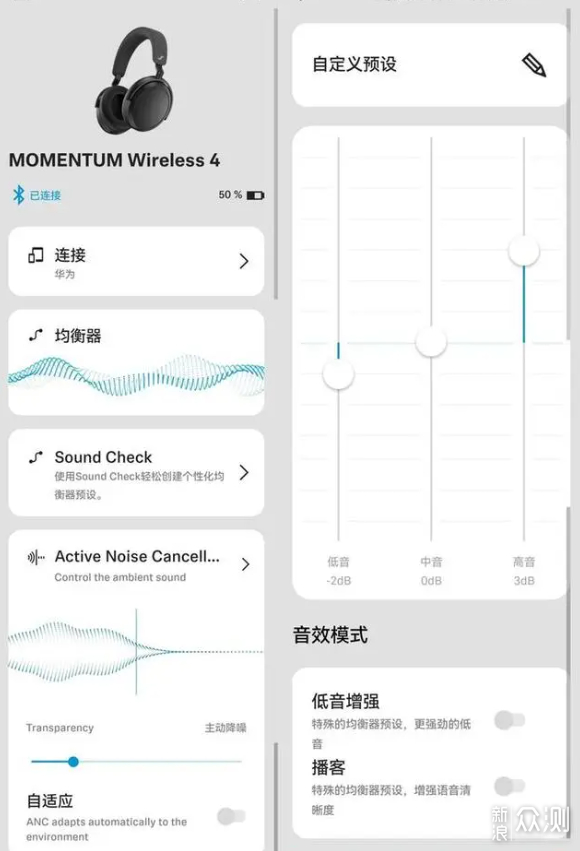 低频:森海MOMENTUM 4低频质感与量感均衡充满了宽松感,展示了老牌德系森海的味道,整体沉稳控制力十足,低频下潜很深,细节表现力丰富,细节方面加入了更多的泛音,力度和打击感显得更为成熟,层次感清晰在无线降噪耳机中算是顶尖水准。
