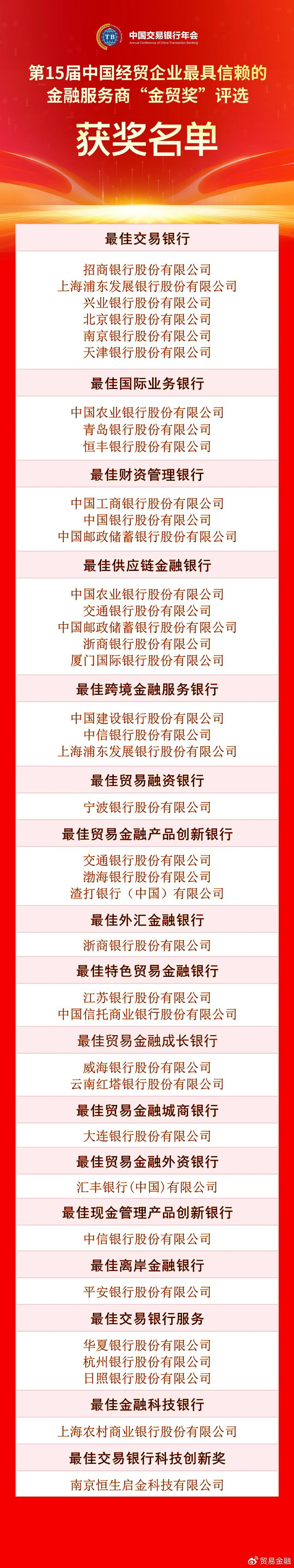 第15届中国经贸企业最具信赖的金融服务商“金贸奖”评选获奖名单