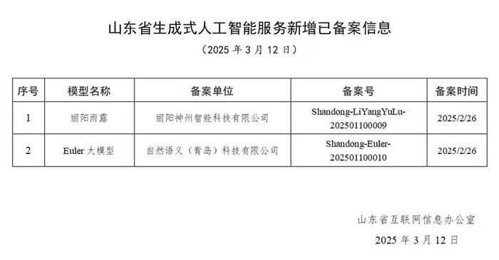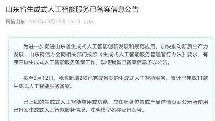 近日,齐鲁晚报·齐鲁壹点记者从市委网信办、市大数据局和济南市人工智能产业发展办公室获悉,国家网信办生成式人工智能服务备案名单公布,济南本土企业丽阳神州智能科技有限公司自主研发的“丽阳雨露”大模型通过备案。该备案是我国规范人工智能技术应用的核心制度,旨在推动技术安全可控、服务高质量落地和稳定投入市场化。目前,济南市有7个AI大模型通过备案,数量居全省首位,占全省11个大模型备案数量的近三分之二。