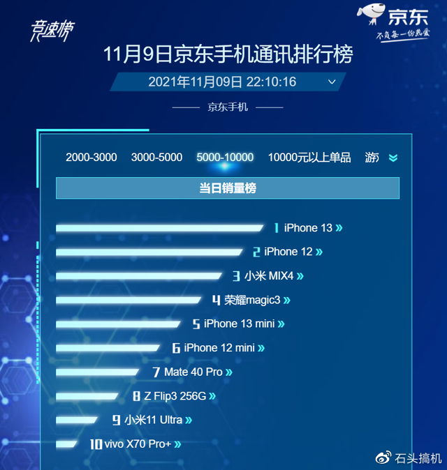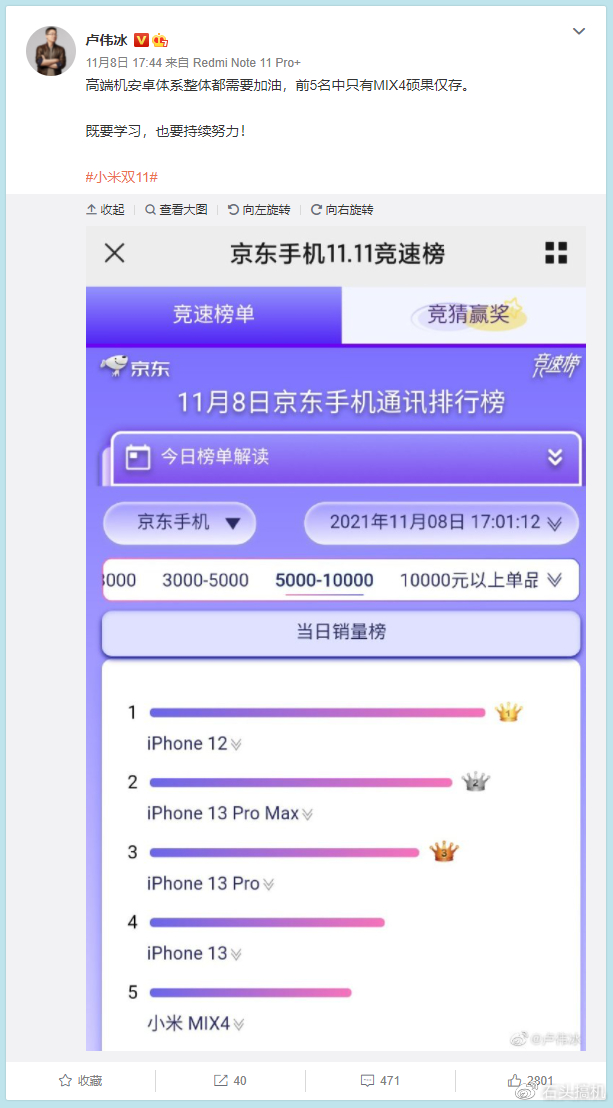 就硬件配置上来说,安卓高端机在屏幕、相机、快充等很多方面都远超苹果iPhone,但令人遗憾的是,安卓高端机还是卖不过苹果。昨天,卢伟冰送上了11月8日的京东五千到一万价位段的手机销量,前五名中苹果iPhone占据了四款,而安卓阵营只有一款小米MIX 4位居第五,卢伟冰表示:高端机安卓体系整体都需要加油,前5名中只有MIX4硕果仅存。既要学习,也要持续努力!