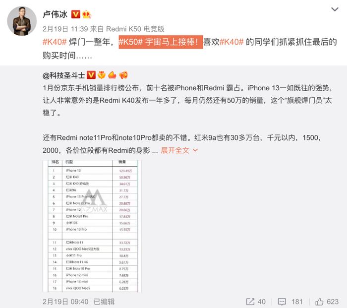 还记得在Redmi K50电竞版的发布会上,卢伟冰总结了上代Redmi K40宇宙的表现,称K40系列全系累计销量突破1000万台,获得2K-3K价位段线上份额第一,焊门一整年。等等。