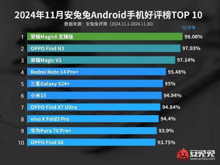 近日,安兔兔根据后台统计到的数据公布了2024年11月国内手机好评榜。注:数据来源安兔兔评测,数据收集时间是2024年11月1日至11月30日,仅限国内市场,仅统计使用安兔兔评测的用户。