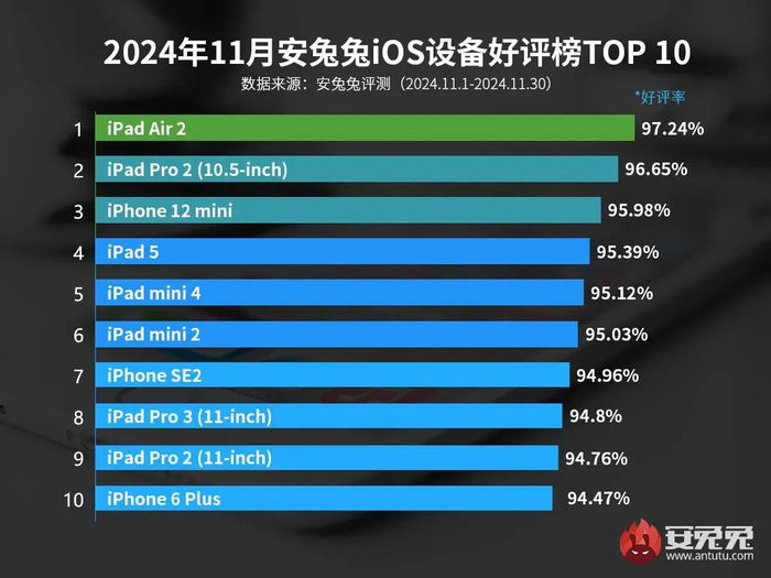 至于iOS设备好评榜,上榜的型号都非常眼熟,多为旧款iPad也算是“老旗舰”了,TOP10中仅有3款为手机,分别为iPhone 12 mini(位列第3)、iPhone SE2(位于第7)、iPhone 6 Plus(位居第10)。最后例行补充说明:安兔兔好评榜是基于安兔兔后台的数据,并不代表市场所有用户的好评度,榜单仅供大家参考~ 就你用过的手机里,你觉得哪台最好用?