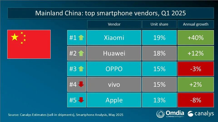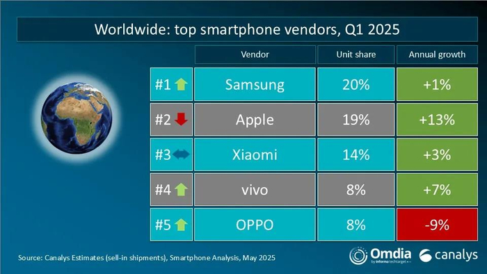 如上图所见,2025Q1全球市场来看,出货量份额TOP5依次是:❶三星,20%份额,同比+1%;❷苹果,19%份额,同比+13%;❸小米,14%份额,同比+3%;❹vivo,8%份额,同比+7%;❺OPPO,8%份额,同比下滑9%。