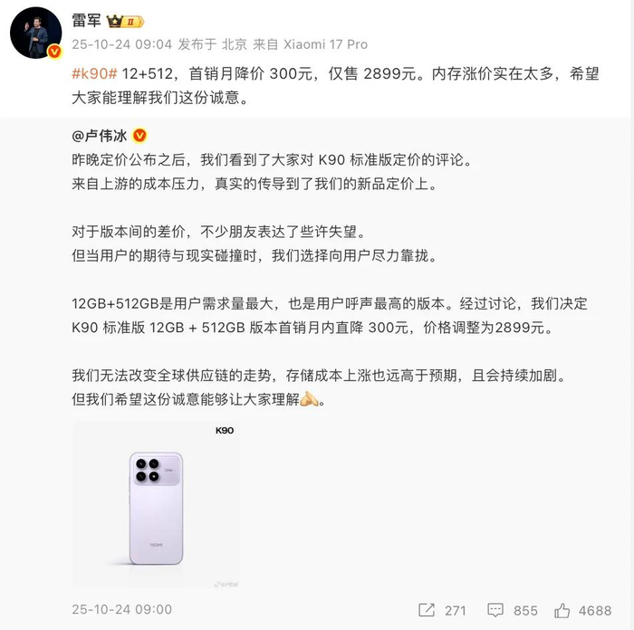 无独有偶,最近小米雷军和卢伟冰两位老总在回应K90定价时也曾透露:「来自上游的成本压力,真实的传到了新品定价上」,「内存涨价实在太多」。
