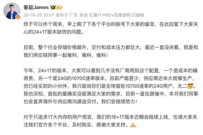 如上图所见,红魔游戏手机产品总经理姜超透露:「目前,整个行业存储价格飙升,交付和成本压力都巨大,今年24GB+1TB的版本几乎没有厂商用到这个配置,一个是成本的确很贵,另一个是24G的10700速率版本,目前产能甚少,供应商还未大规模生产。」