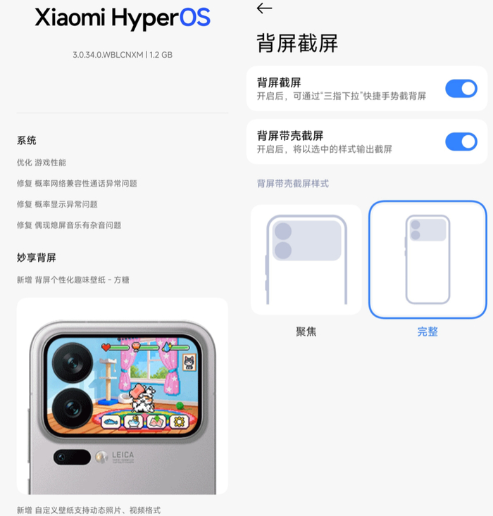 据网友反馈,小米17 Pro系列手机已开启HyperOS3.0.34.0正式版内测升级,除了优化游戏性能、优化相机画质效果/提升拍摄的流畅度和稳定性外,最主要就是针对背屏玩法进行了上新:新增背屏个性化趣味壁纸-方糖,新增自定义壁纸支持动态照片/视频格式,新增在背屏用三指下拉手势进行截图、支持多种带壳截屏样式,新增支持生成的背屏AI壁纸一键保存至相册等等。其中背屏新增的方糖趣味壁纸还有互动属性,类似养成系电子宠物。