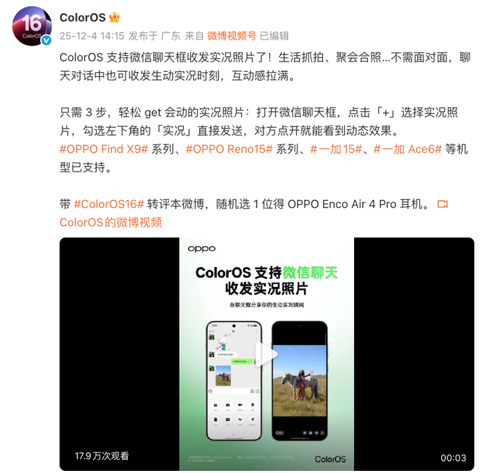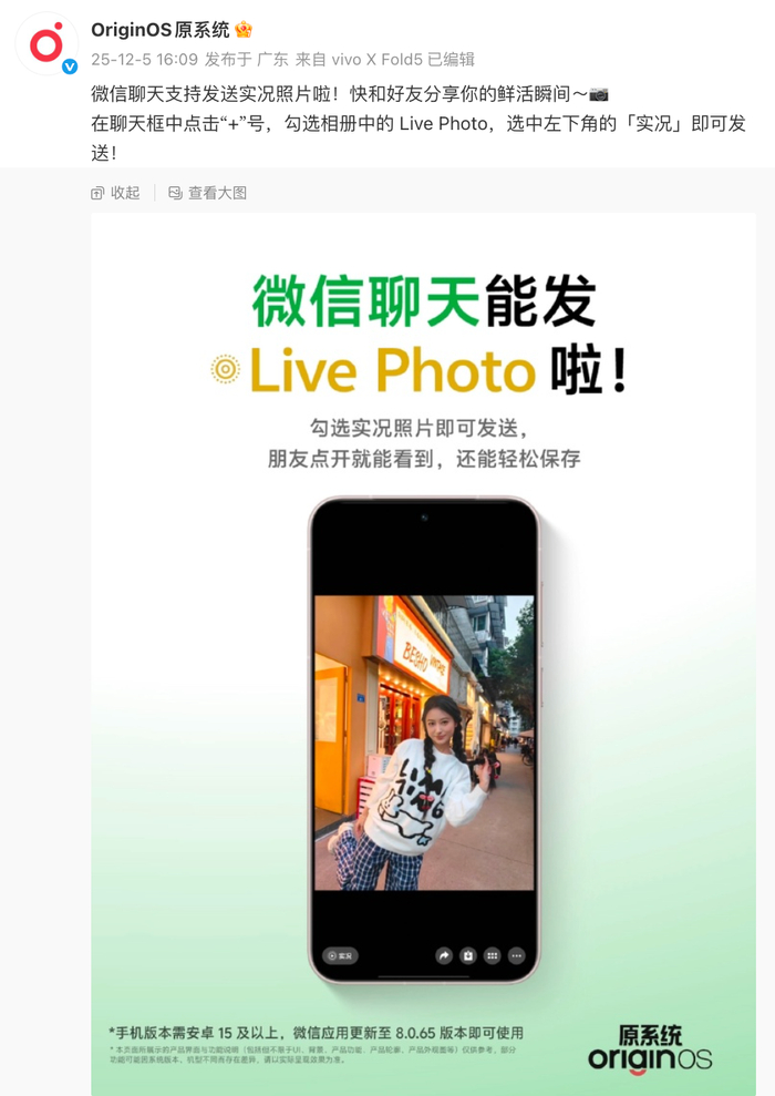 今年7月份,微信iOS端开始灰度测试聊天收发Live图(9月份正式上线),随后微信安卓端也有测试相关功能,但后续不知为何又“云撤回”,大概到11月初才开始再次灰度,最近随着微信安卓端应用更新,越来越多品牌手机官宣支持发送。