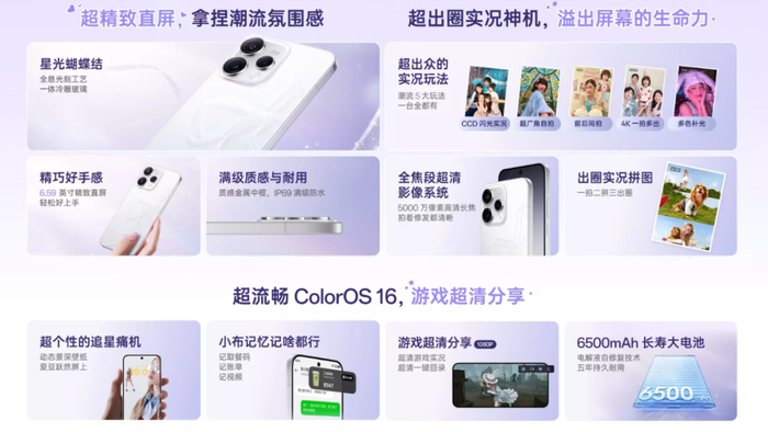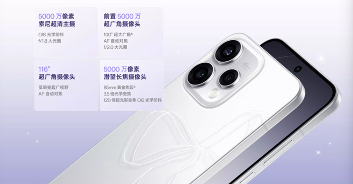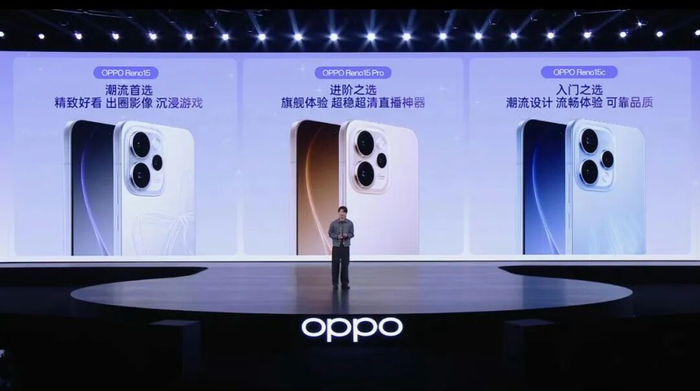 据了解,OPPO Reno 15c主要配置有:6.59英寸的1.5K 120Hz LTPS居中单挖孔OLED直屏,短焦光学屏下指纹,提供极光蓝、学院蓝、星光蝴蝶结3个配色,机身厚约7.77mm机身重约197g,前置50MP,后置三摄①50MP主摄 ②8MP超广角 ③50MP 3.5X潜望长焦,搭载骁龙7 Gen4处理器,6500mAh电池,80W有线充电,支持IP69&IP68&IP66三重认证、NFC、红外遥控、单频GPS、USB 2.0。