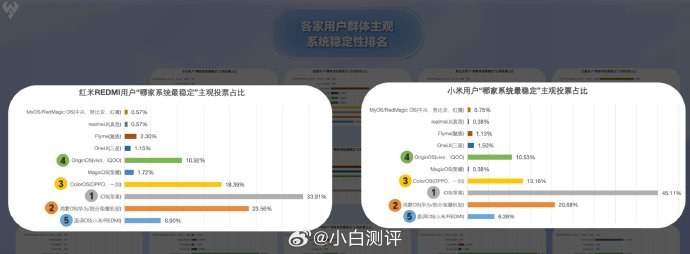 #哪家手机系统Bug多# 之前收集了大家关于手机系统的反馈。在各家用户群体的主观系统稳定性排行投票里(此结果可以一定程度上反映各家用户的系统偏好),O加V果华用户都认为自家系统最稳定,小米和红米用户的投票前五名则依次是①iOS ②HarmonyOS ③ColorOS ④OriginOS ⑤澎湃OS。