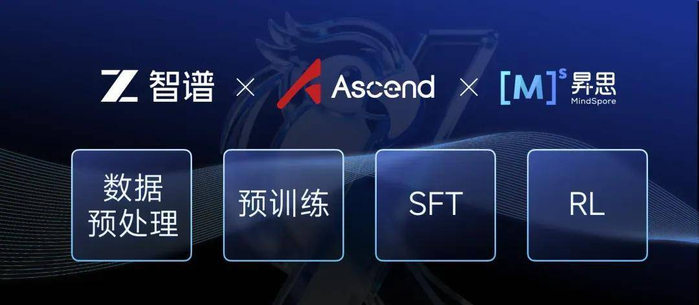 智谱官方公众号给出了答案:“依托昇腾NPU和昇思MindSpore AI框架,使用动态图多级流水下发、高性能融合算子、多流并行等特性,我们自研了模型训练套件,全面优化数据预处理、预训练、SFT和RL的端到端流程。”