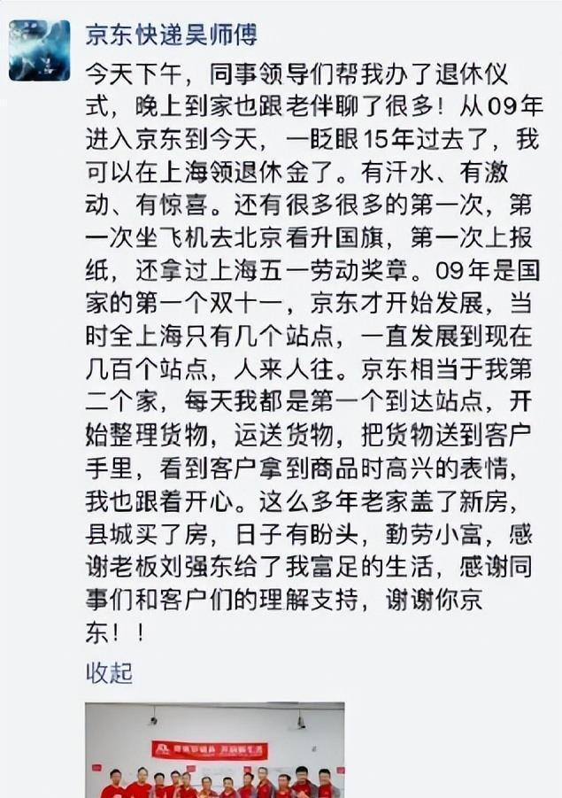 今年9月,一位60岁的京东快递员吴咸满在上海退休。他2009年入职京东,退休前月薪一万五。 在老家盖起三层小楼,在市区买了128平的三居室,还给儿子添了辆新车。退休当晚,他在朋友圈发文感谢刘强东,“给了我们一家富足的生活和安定的晚年”。在京东工作15年的分拣员陈海彦,首笔退休金到账5390元。而和他同一批退休的,全京东有1600多人。以此来看刘强东“让兄弟们都吃上肉”并不是一句空话。