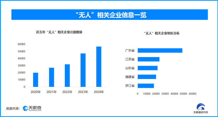 天眼查专业版数据显示,截至目前我国现存在业、存续状态的“无人”相关企业超34.3万家。其中,2025年截至目前新增注册相关企业约8.1万余家,从企业注册数量趋势来看,近五年间,“无人”相关企业的注册数量呈现出逐年增长的态势,并在2024年达到顶峰。
