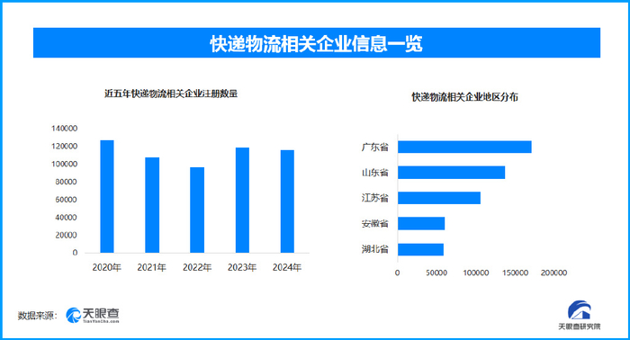 天眼查专业版数据显示,截至目前我国现存在业、存续状态的快递物流相关企业超131.9万家。从企业注册数量趋势来看,近五年间,2021、2022年快递物流相关企业的注册数量呈现出明显的下降态势,近两年注册量有所回升,但仍未超过2020年的数量顶峰。从区域分布来看,广东省、山东省、江苏省快递物流相关企业数量位居前列,三个省市数量总和超过41.3万家,占企业总数的31.35%。