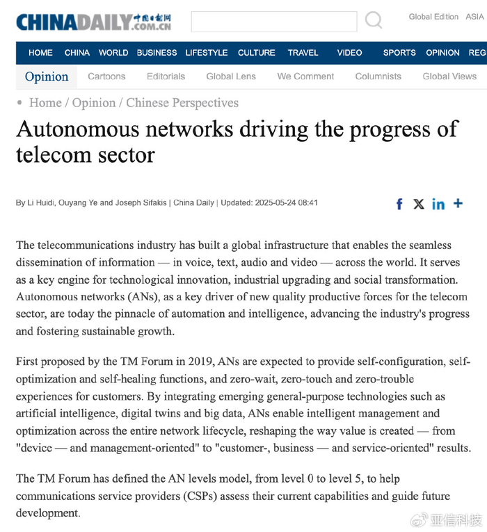 近日,中央主流媒体《中国日报》中、英文版同时刊发TM Forum董事、中国移动通信集团有限公司副总经理李慧镝博士,亚信科技首席技术官兼高级副总裁、IEEE Fellow欧阳晔博士,图灵奖获得者、中国科学院外籍院士约瑟夫·斯发基斯博士联合署名的特约文章《自智网络,为通信产业新质生产力发展注入新动能》。作为自智网络发展的指引性文章,文章明确自智网络作为通信网络演进的重要发展方向,通过AI原生与智能体等新兴通用目的技术加速自智网络向高阶、智能化演进的进程。自智网络已成为推动通信产业全面数字化转型和高质量发展的新质生产力,为整个通信产业乃至社会发展持续注入创新动能。