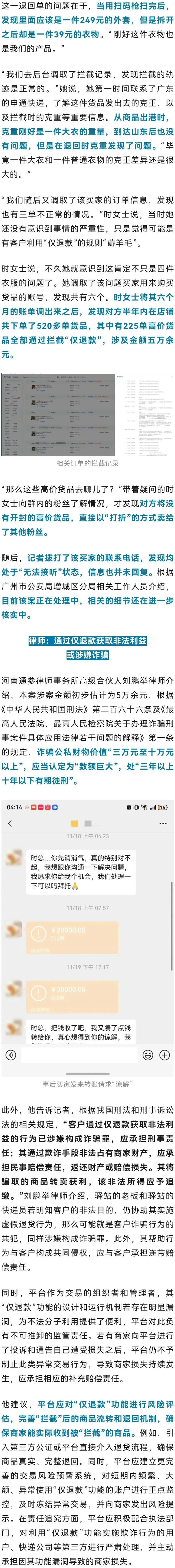 近日,有商家在社交媒体曝光——半年来,她被买家刘某利用平台漏洞,用6个账号的“仅退款”功能,造成225个订单相关货款的数万元损失。