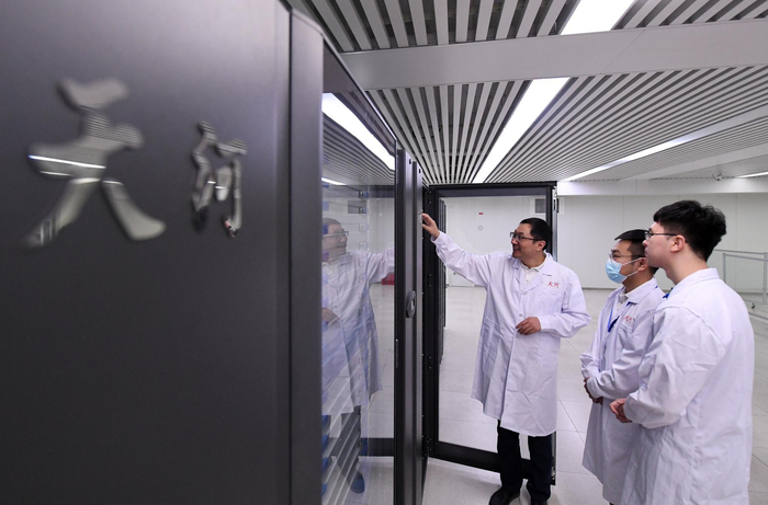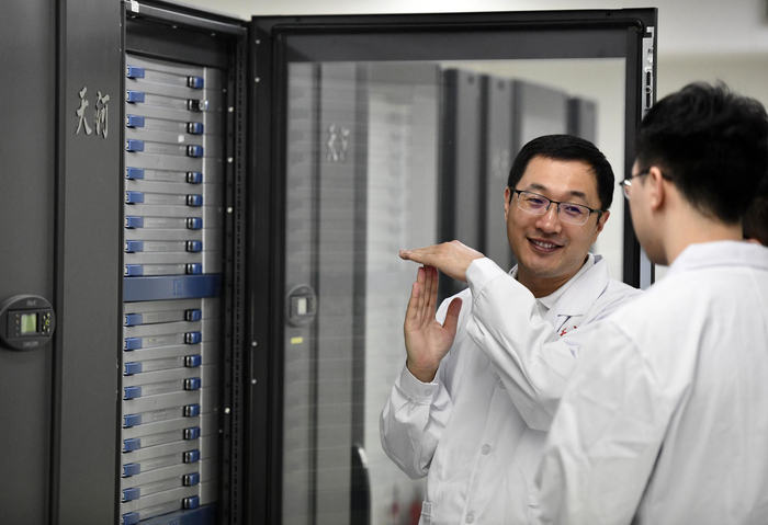 在国家超级计算天津中心“天河三号”原型机机房内,孟祥飞(左)和同事一起巡查(5月27日摄)。新华社记者 赵子硕 摄