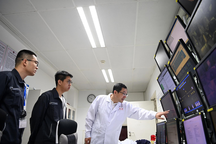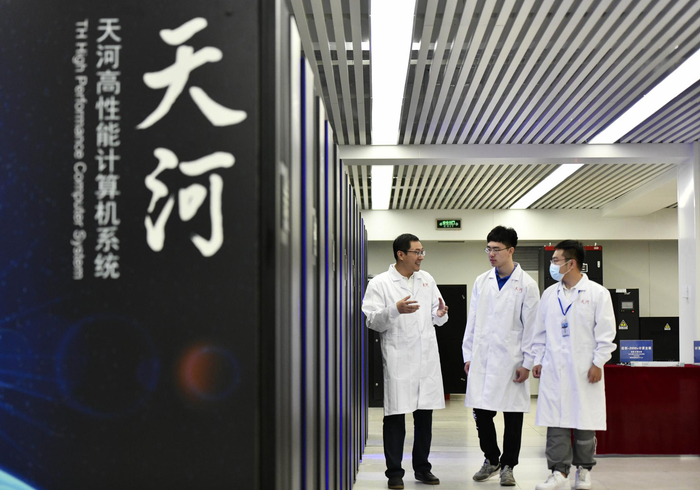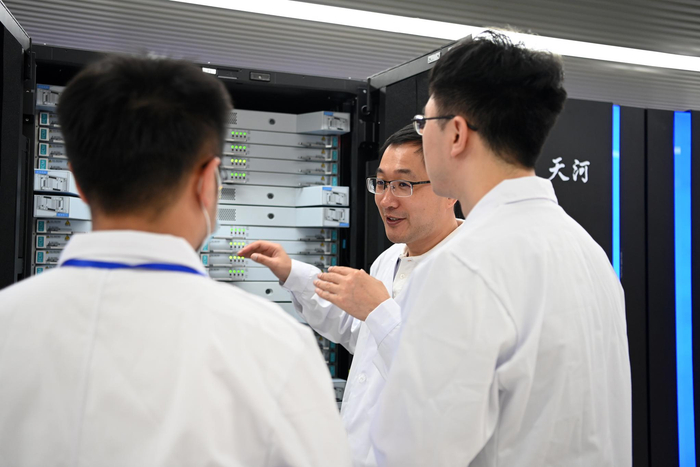 在国家超级计算天津中心“天河三号”原型机机房内,孟祥飞(中)和同事一起巡查(5月27日摄)。新华社记者 李然 摄