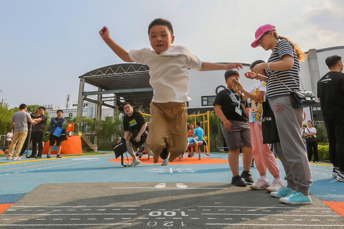 5月30日,小朋友在AI社区运动公园进行立定跳远。新华社记者 王翔 摄