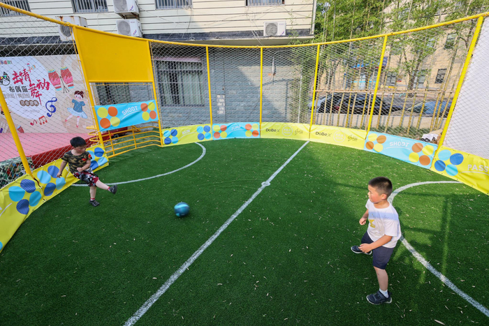 5月30日,小朋友在AI社区运动公园玩笼式足球。新华社记者 王翔 摄