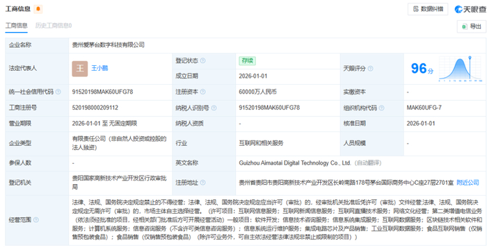 贵州茅台成立爱茅台数字科技公司 经营范围含集成电路芯片及产品销售等