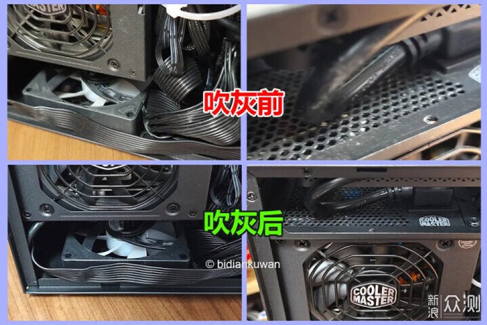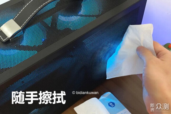 这样紧凑的空间,外加全黑网孔侧板,亮灯后的机箱也不是那么容易显出灰尘来,最多只是在CPU风冷对着的那个侧板小区域显出一圈积尘,但清理这种积尘简直不要太轻松。