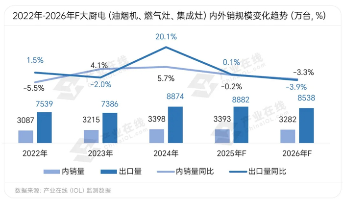 展望2026年,产业在线认为厨电内销市场在 “以旧换新” 等国补政策效应逐步退坡后,或将面临进一步承压;出口市场虽长期具备增长空间,但短期内受多重因素交织影响:欧美市场通胀高企、部分海外区域已进入存量竞争阶段、海外房地产周期下行调整,叠加地缘政治冲突与贸易壁垒等外部变量,行业仍将面临阶段性挑战。